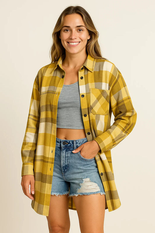 Women's Blouse Green Polyester Plaid Long Sleeve Casual Loose Fit