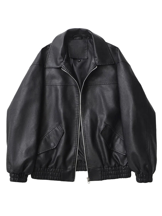 Women's Faux Leather Jacket Retro Loose Fit Short Zip Coat