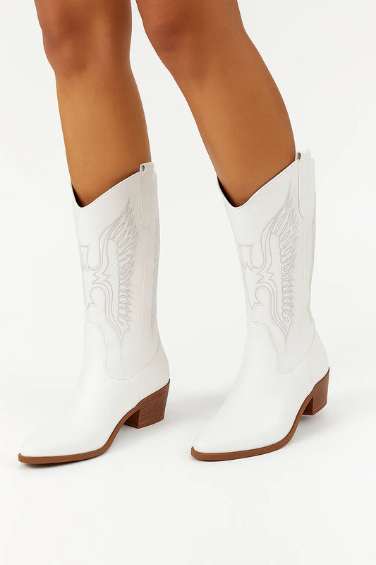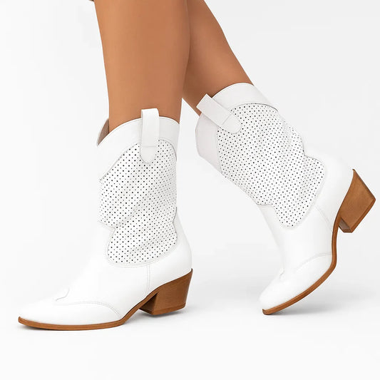 Women's Cowboy Boots White Leather Breathable With Zipper Casual Style