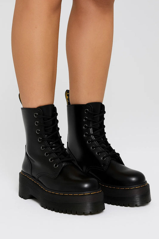 Women's Chunky Combat Boots Black Leather Look High Platform