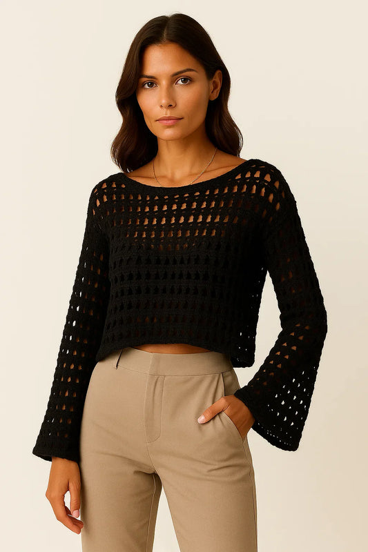 Women's Crochet Top White Wool Knit Long Sleeve Crop Pullover Beach Bikini Cover Up