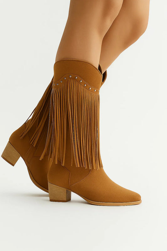 Women's Suede Boots Gray Fringe Block Heel Pointed Toe Elegant Silhouette