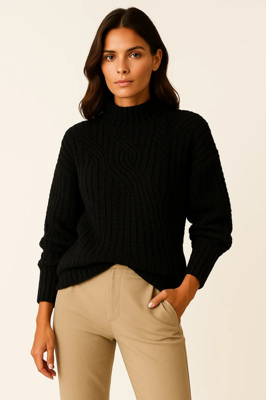Women's Sweater Beige High Neck Cable Knit Soft Relaxed Fit for Autumn and Winter