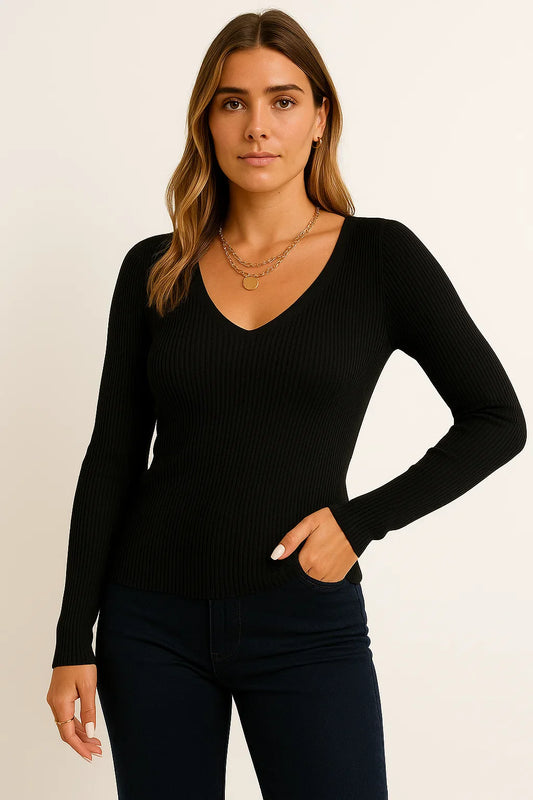 Women's Pullover Sweater V-Neck Ribbed Stripes Long Sleeve Soft Knit Autumn Winter Casual